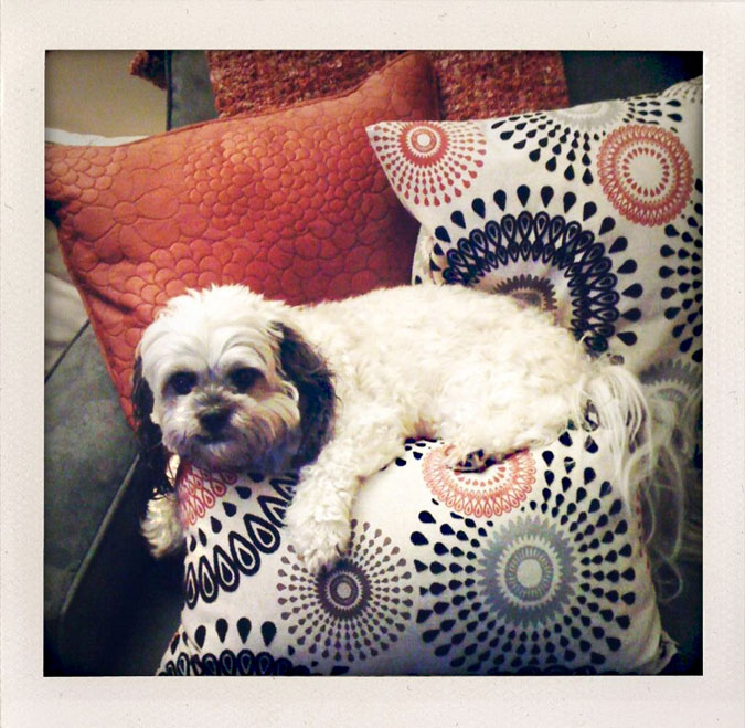 This is Sadie Mae — a pekingese-poodle mix of 8 years old — on her favorite pillow on the sofa.