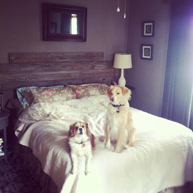 Here are two instagram shots of mine and my roommate’s rescues Oliver (little one, hers) and Harvey (larger one, mine). Most of my furniture comes from consignment finds or deeply discounted modern stores. I constructed my headboard from reclaimed wood that survived our old train station fire here in Panama City, FL. The mirror above the bed is a 150 year-old mirror that was given to me by a friend, and had been passed through her family for generations. Also, Harvey and Oliver are best best best friends.