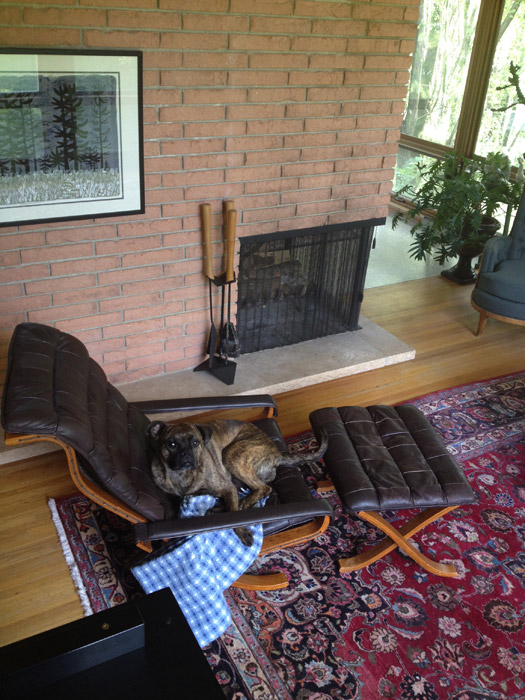 In the photograph, Lily is lounging on a Westnofa chair in our 1963 Saint Paul, MN living room. I’ve tried to snap this photograph on other occasions, but she’s an unholy terror and never still enough to catch the shot. I had to sneak up on her, from behind the piano, to get this one…