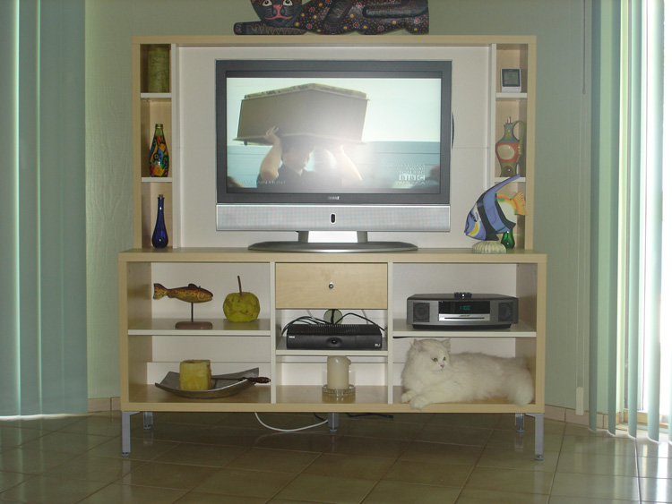 Here is a photo of my cat Remington in our Ikea tv stand in the Florida Keys. It is a vacation home and he is relaxing near the tv.