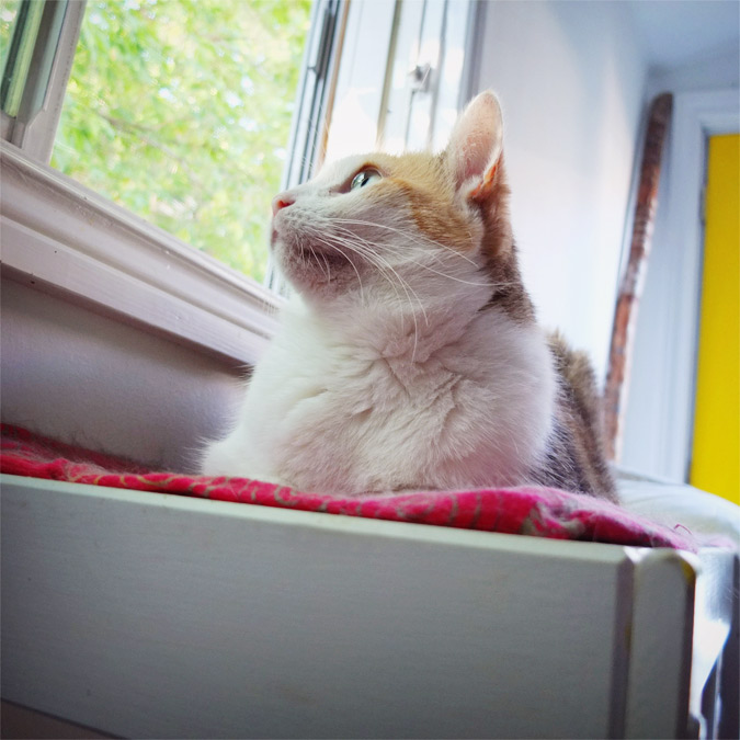 Phoebe watching birds from the Ikea hacked baby changetable turned cat perch. Behind her is a tall branch that is nice and straight that I found at the cottage – perfect for a curtain rod.
