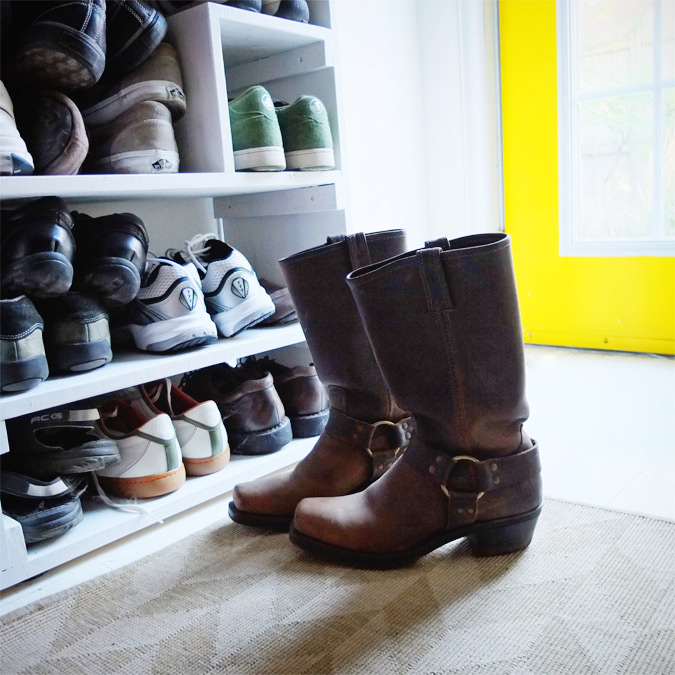 My Frye moto boots at the backdoor next to a shelving unit my husband built to store his shoes.