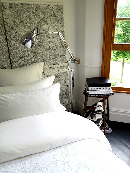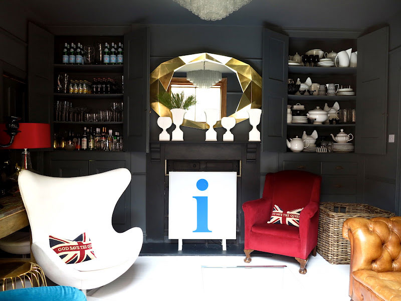 What an amazing home! I love the contrast between the dark walls and light floors and visa versa with bright eclectic accents! The puppy is adorable too 🙂