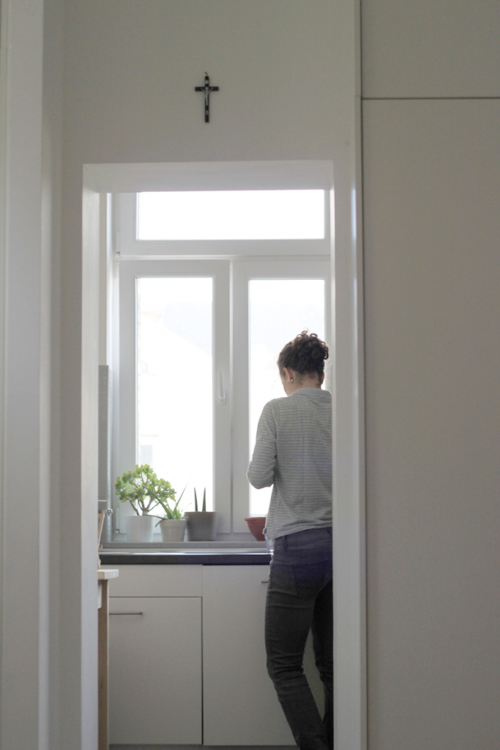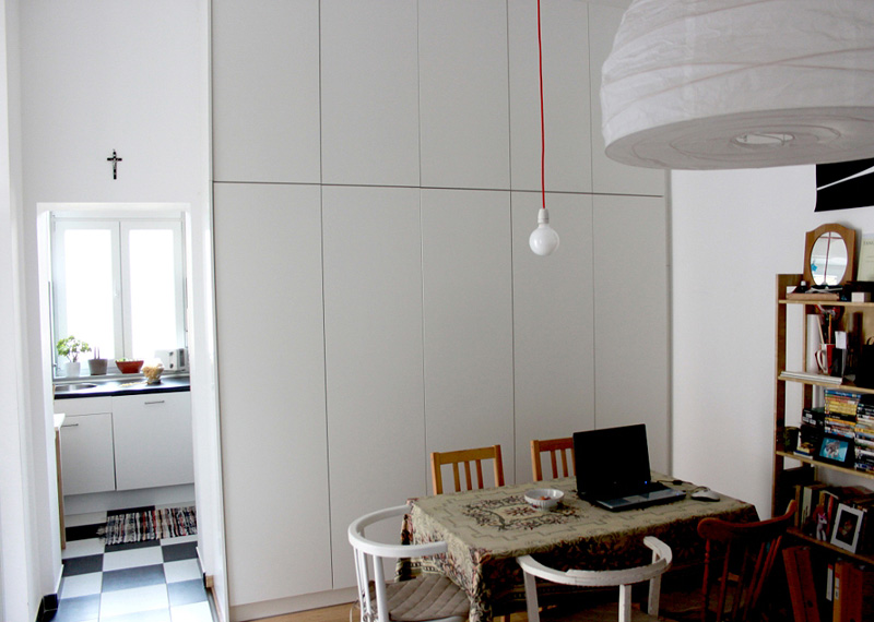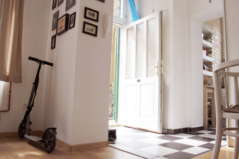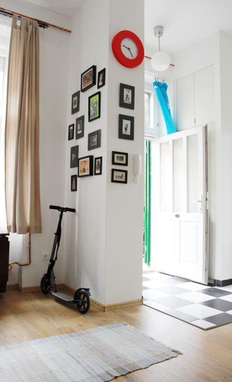 I’m so excited to have yet another reader’s home to share with you this week. This one is Orsi’s flat in Hungary. My flat is in city center of Budapest, it is very small only 398 sqf (37 m2) in an old apartment house. I made this renovation in the last year. I have one bedroom, one hall, one small kitchen and even smaller bathroom. The most important aspect was to keep clear. I do not have a lot of furniture appears to be larger. I made my headboard, I had some small sheet of carpet and I stick all of them. There is a wall with some photos, only here I put all pictures and photos, it is not full yet. My conclusion: sometimes the simple is the most difficult. đŸ™‚ Yet another adorable little apartment that would involve serious downsizing for most people. I love the b/w checkerboard floor in the kitchen and hallway (it’s been a favourite of mine for eons) and the headboard is such a creative DIY! Fantastic little home Orsi!!