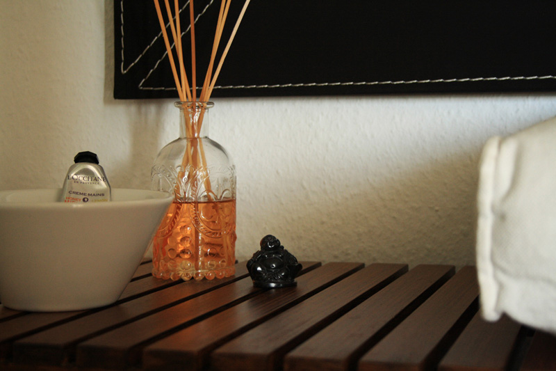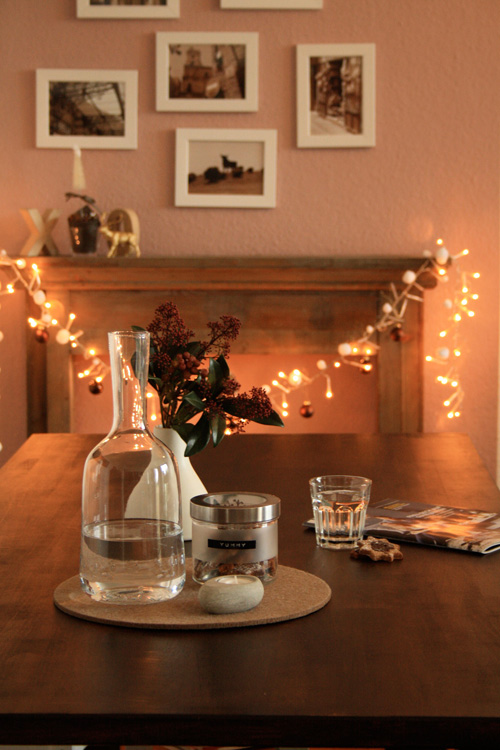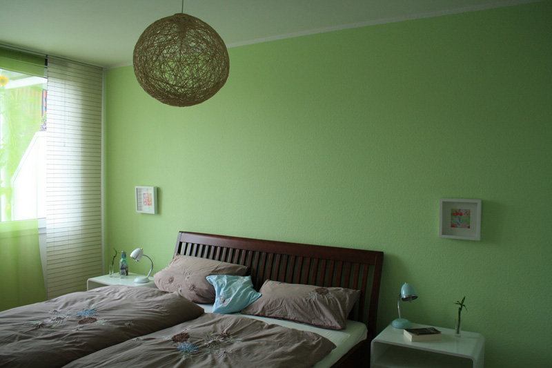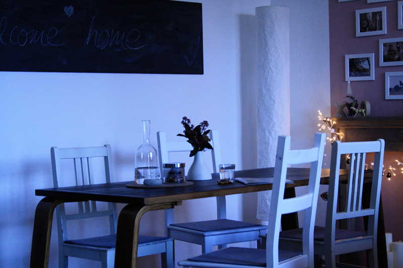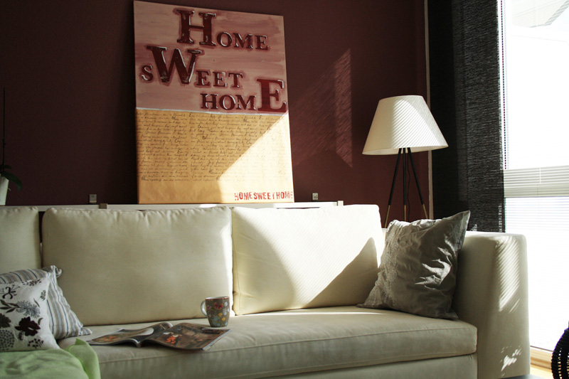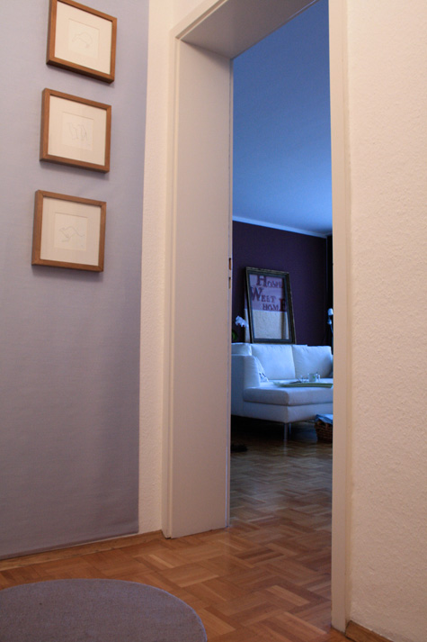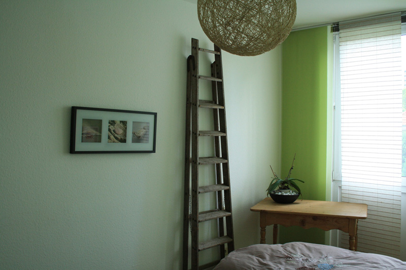 Today’s reader’s home comes from Carolin: I’m 34-years-old and I’m living in Cologne, Germany, working as a graphic designer. I love living in a comfy & neat home and I do love to craft, so I renovated this 60 sq m apartment completely on my own. I painted the walls, built some lamps and the table, painted the chairs and did the art work (also the photos, as I love to photograph, too). Some furniture is new, some is from my grandma, and some are flea market finds – like the ladder, which I brought home by foot, though this was a 2 hour walk ;). I love the cosy vibe of Carolin’s place, especially how she used paint to create interest on the walls – instead of just doing the typical focal wall. And WOW – great DIY art!