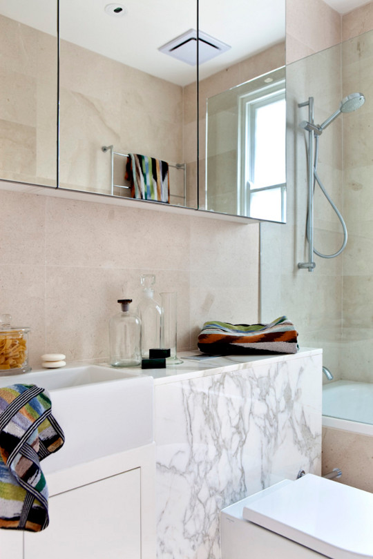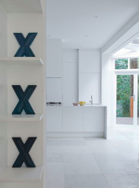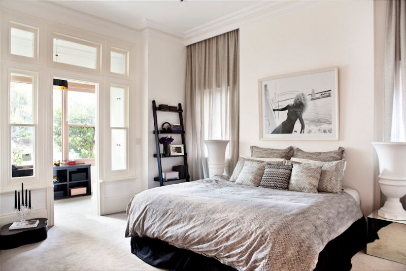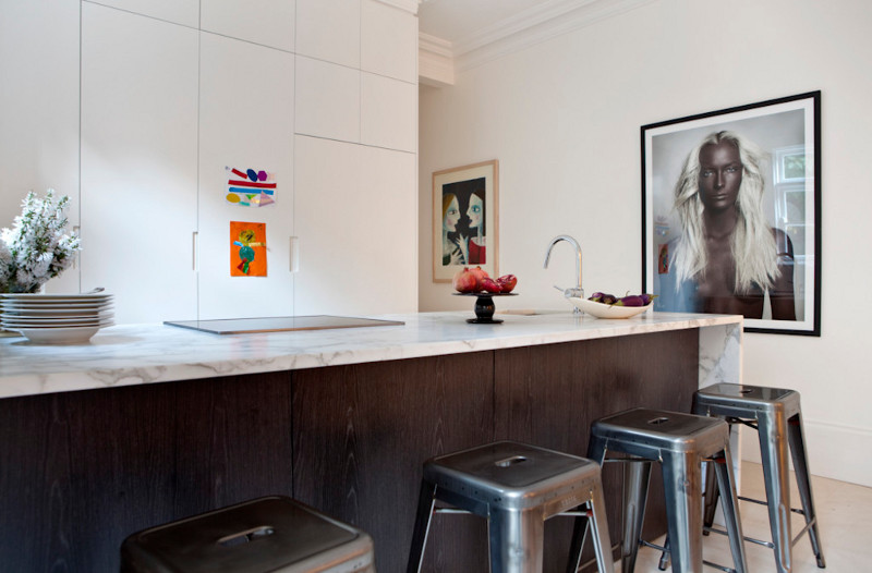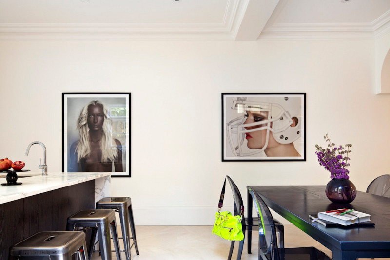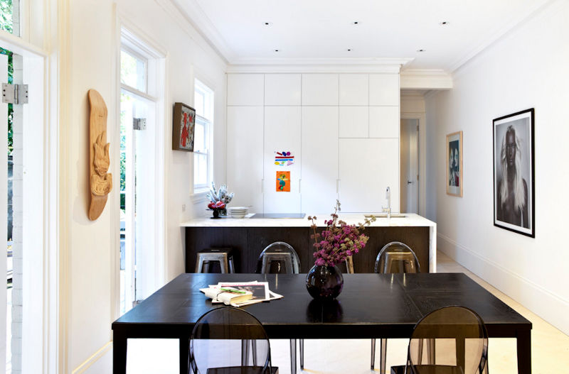 Sophisticated, contemporary interiors by Dina Broadhurst. First an apartment renovation that mixes the functional with the funky. The use of large scale photography in the open plan kitchen/dining provides punctuation points in the sleek modern design. Clean lines and functionality meet Dina’s take on individuality and luxury. The second kitchen is ultra sleek taking advantage of a bank of beautiful old windows that let in the light to play off its bright white surfaces.