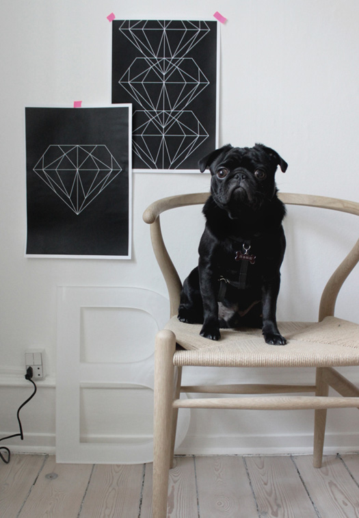 This is my lovely little black pug Elliot – helping me “spice up” a picture for my blog of a classic Wegner chair as well as my newly made posters with diamant pattern.