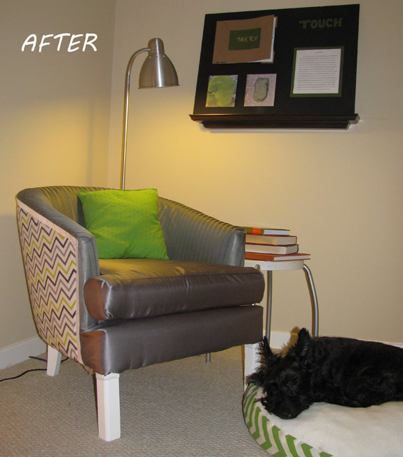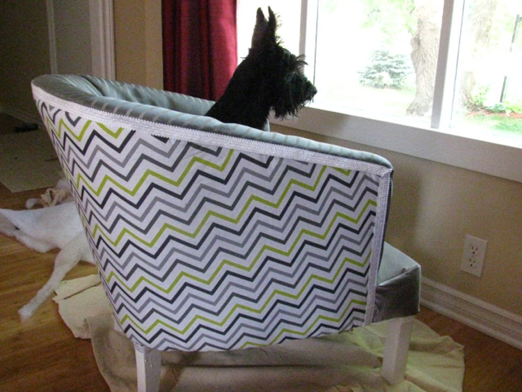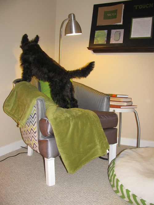 After recovering a chair, my Scottish Terrier, Greyson, decides to claim it to watch for his arch-nemesis, the squirrel. Later, he jumped in my ‘after’ photo.