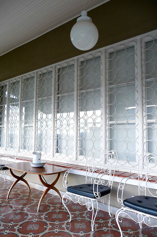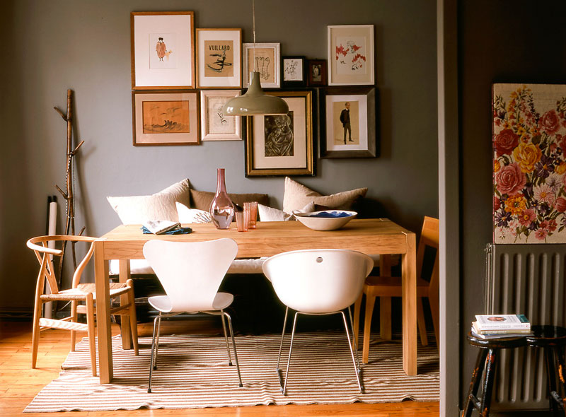 I really like the artwork ensemble with the dining table. The bench and loungy cushions against the wall and the eclectic mix of chairs is also really inviting. I could eat and work there myself.