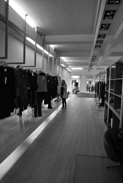 Belgian architect Dieter Vander Velpen emailed us with an intriguing project he recently completed. At first I wondered about blogging it as it’s a commercial space and we prefer featuring residential designs but this one could be REALLY fun translated into a residential space. This project is Garde-robe Nationale, a womanswear boutique in Antwerp where Dieter acted as artchitect and interior designer. The lighting in the ceiling was bulky, the clothing racks stuck out into the space and were on risers, and it was pretty dull overall.