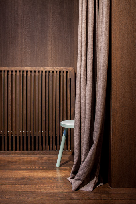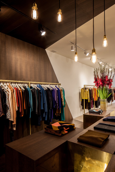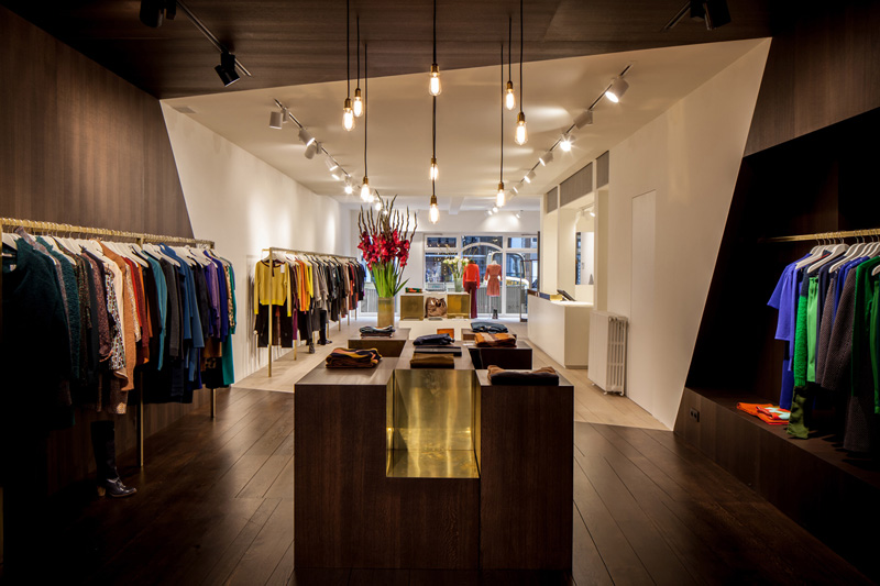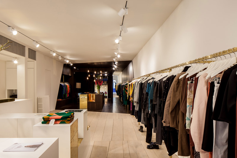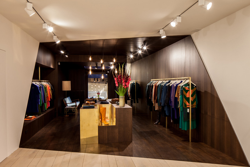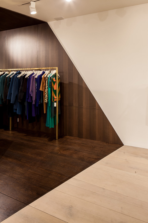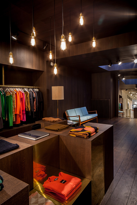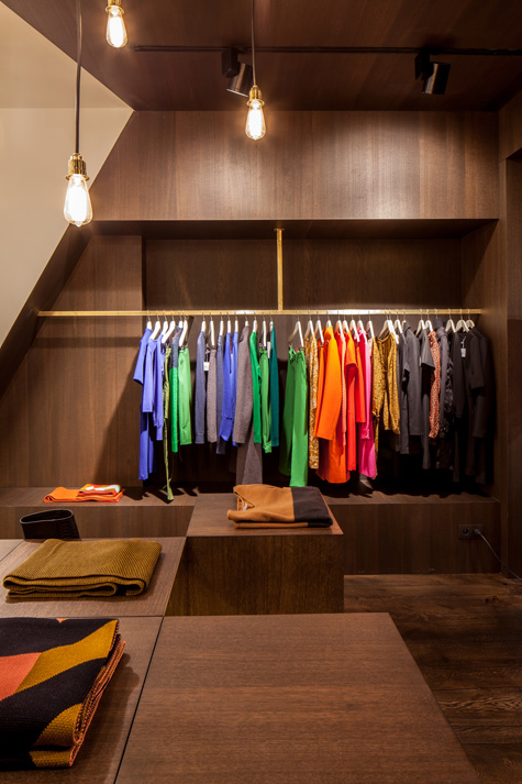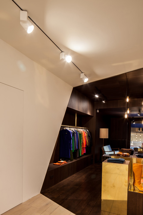 Dieter worked some serious magic on this shop. The floors were levelled out and original hardwood restored, the majority of the clothing displays were lined up on the outer walls for better sight lines through the shop and then my favourite element – the introduction of a light and dark zone. The front of the store is now all in white, and as you move along towards the rear where the fitting rooms are, the vibe is much more loungey with dark oak veneer walls and ceiling and floors stained the same dark shade. I think this would be such a phenomenal space if you think of it as the main floor of a home. Imagine the light zone as the kitchen and connecting dining space, and as you move into the dark zone you are in the sitting room with a huge sectional and and big TV built-into the wall with a long, low media cabinet….yes, I can see the potential…. (photos by Thomas De Bruyne)