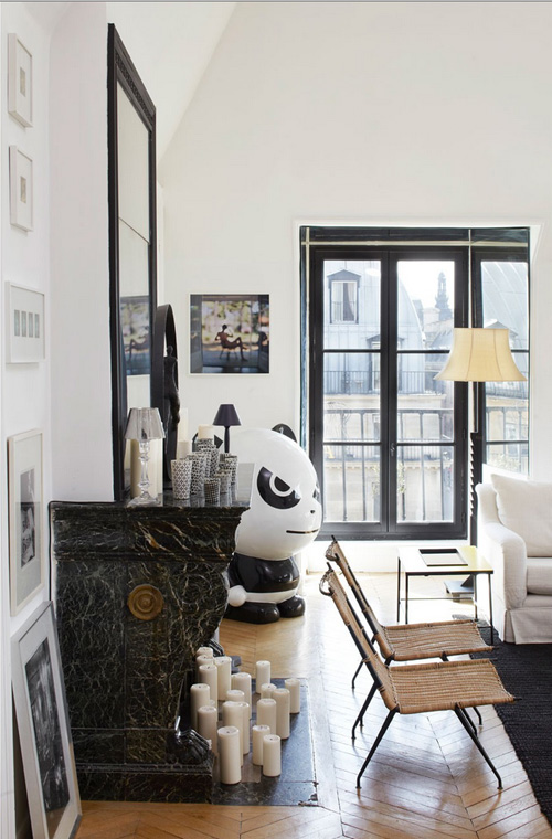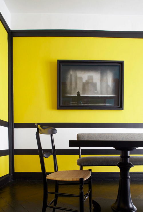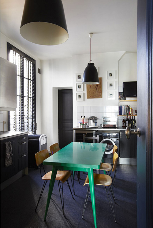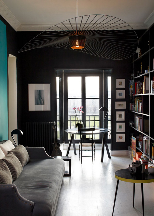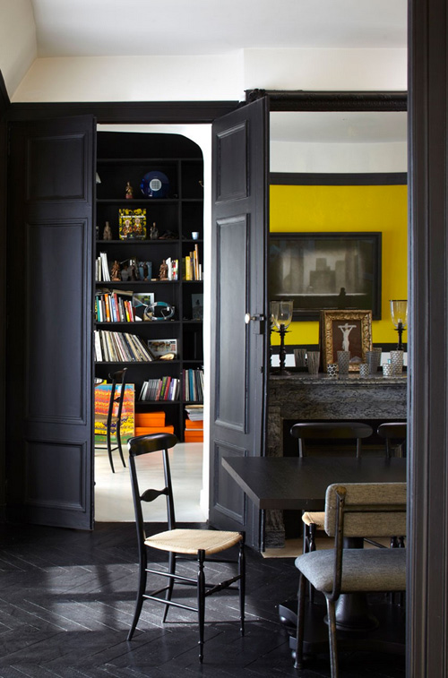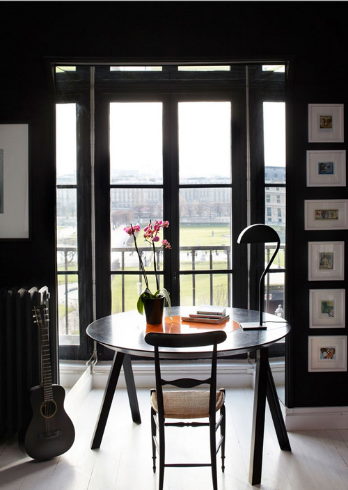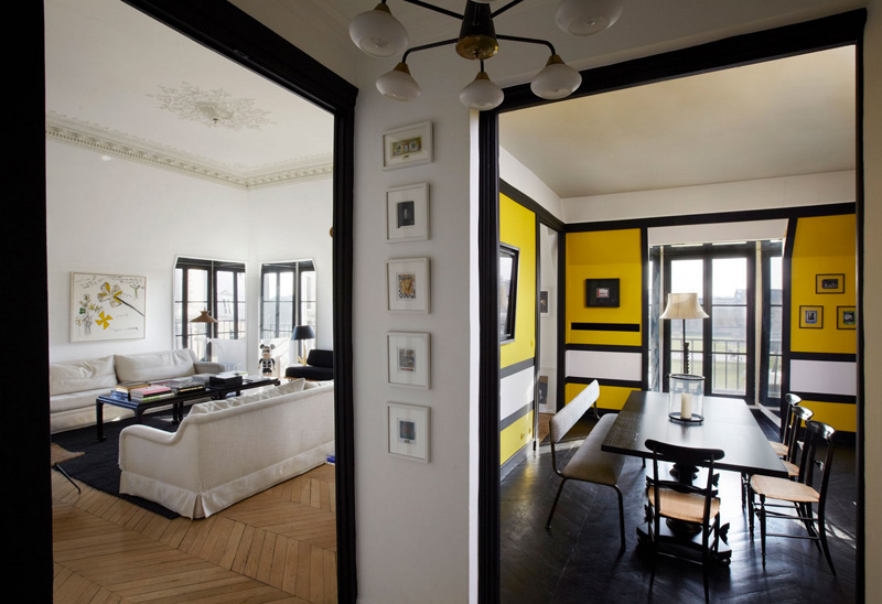 Wow, that is one big apartment! It would fit four or five cupboard-sized ones like most Parisians (the ones I know!) have. The black is so dramatic, but works here with all that pop art and coloured furniture, and some white/light rooms to balance Feeling a major crush on the furniture – that green table, the little side table with band of yellow – and big envy at the space to spread out art reference books and browse. And the view's not bad either.