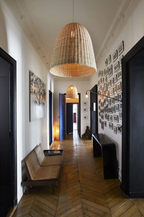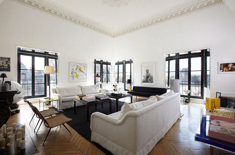 Love the apartment!… what I find stunning in particular is the contrast of the black and white with the bright yellows and blues….I find they contrast greatly together…The classical rhythm of the interiors play beautifully with the modern furniture pieces and of course the art!….It has a simplicity and cleanliness in lines but you can feel the richness in textures and elements … The ceiling fixtures are outrageous!… love them all!…..Great project!