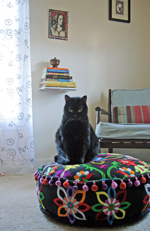 Here is Neko on the hunt for her favorite spot in our new house. So far the chair is winning, but she looks fantastic on the poof.