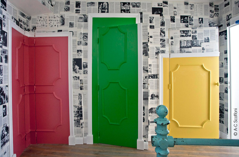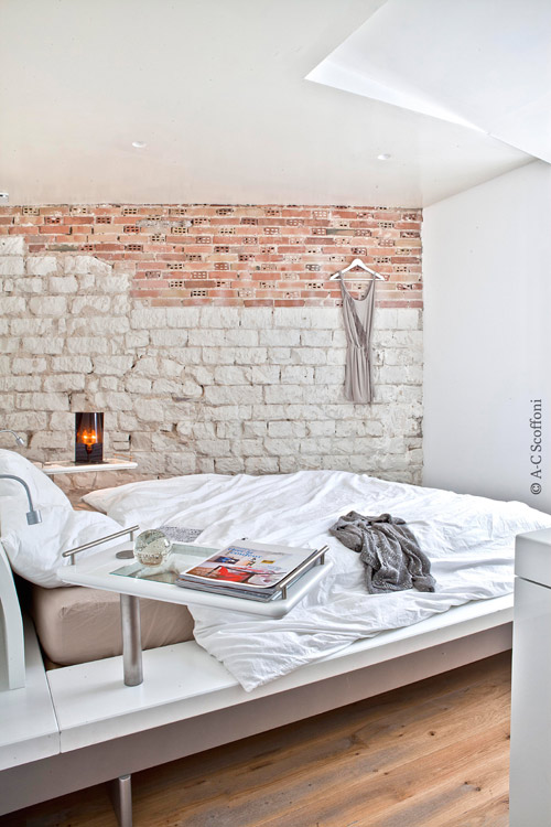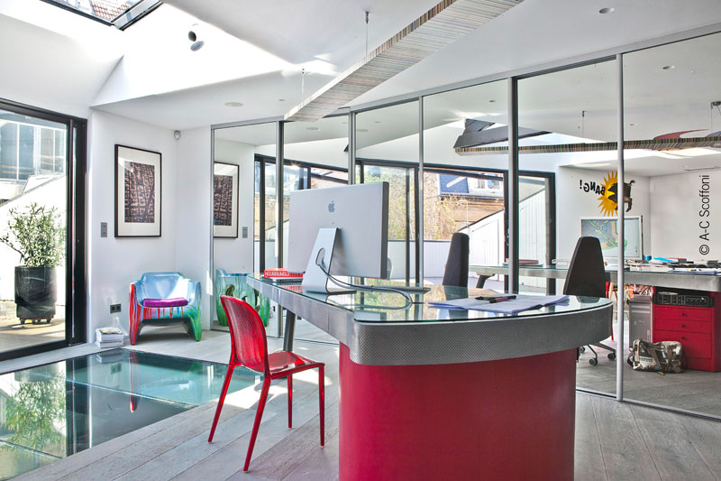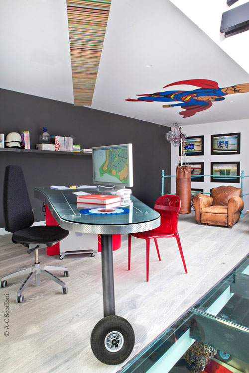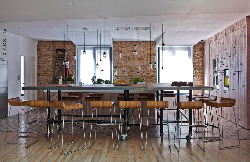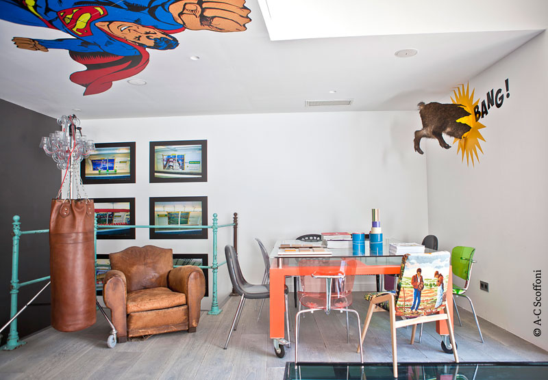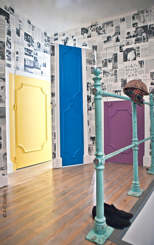 Let me start by saying it has been a long time since we blogged anything this wacky and eclectic. It is a completely renovated 3 story apartment created by Parisian interior architect and designer Carlos Pujol. It is oozing with creativity and whimsy, from the eyeglasses chandelier, to the paint chip staircase, the mass of pendants in the kitchen and pinups in the bathroom. This is definitively not taking interior design too seriously. 🙂
