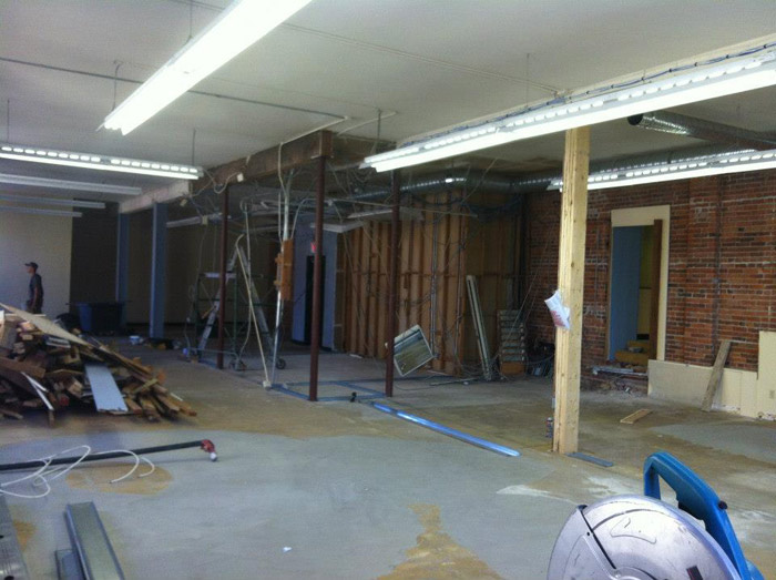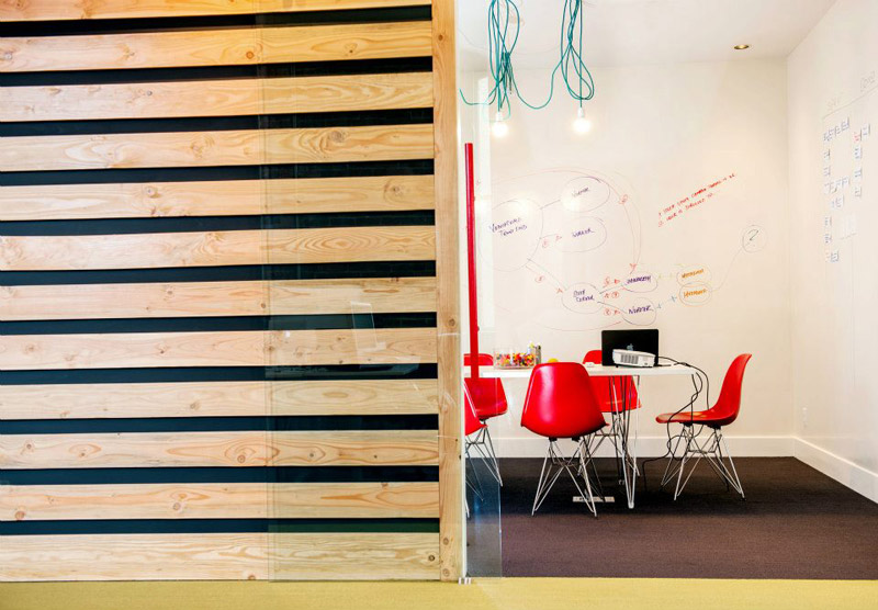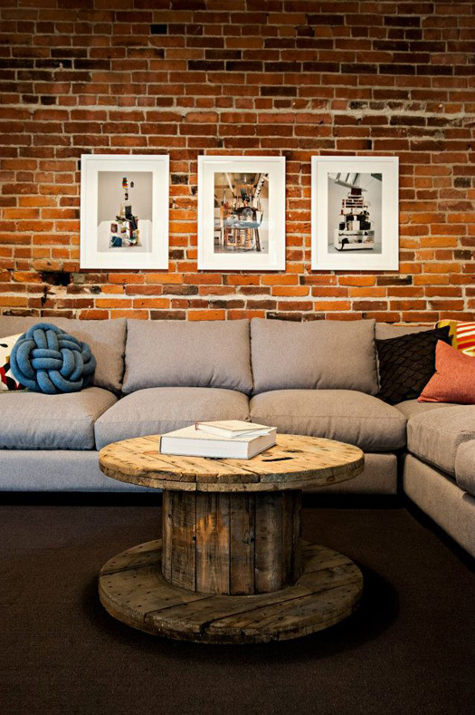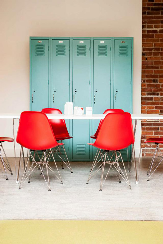 Interior designer Kyla Bidgood emailed us about one of her latest projects – and it’s a doozy! It is the office of an up and coming tech company in Victoria, BC. She has turned an ugly commercial space into a fun and energizing work space that should generate all kinds of creative techie juices flowing. The vintage industrial vibe rocks and the accents of red really pop. LOVE IT! (So jealous – I’d die for my cubicle to be this cool). Here is some info from Kyla:
