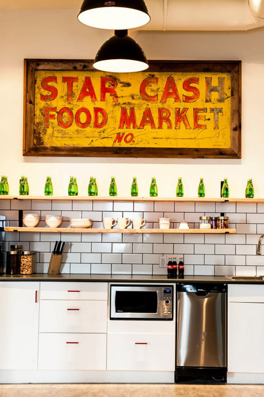 I LOVVVE the kitchenette room! The vintage signage & those lockers.. mixed with the modern furniture.. AHmazing! And of course the pendant lights look pretty rad with that awesome dry erase wall.
