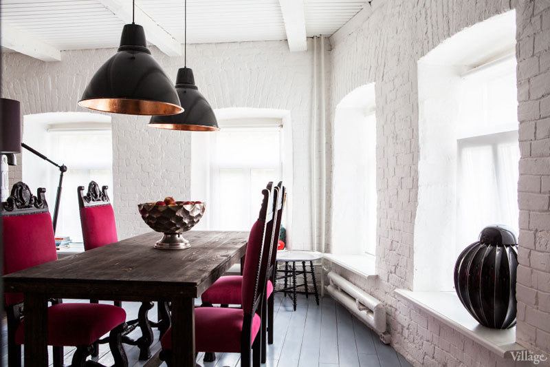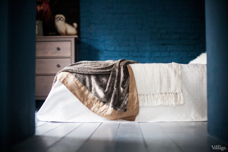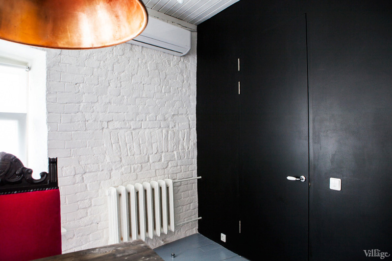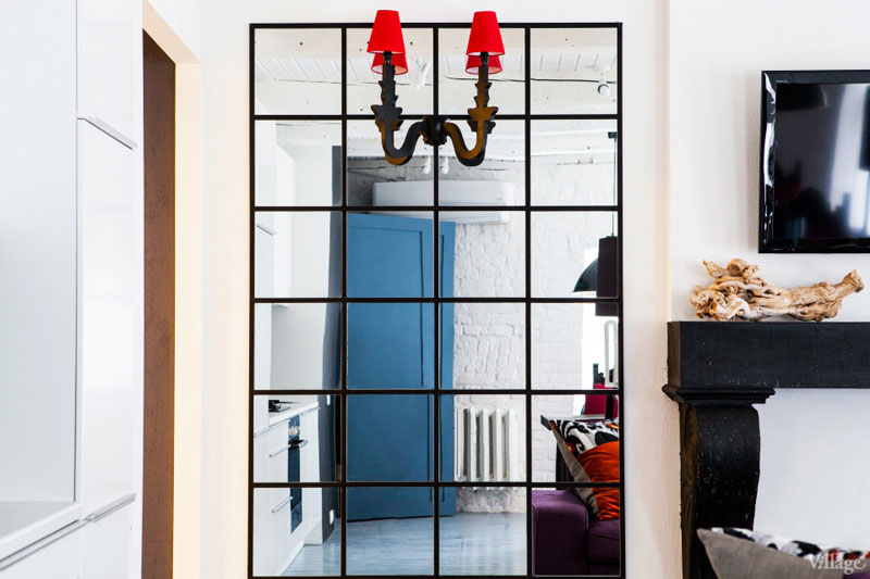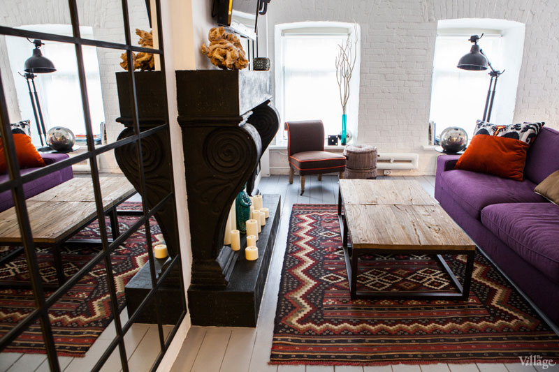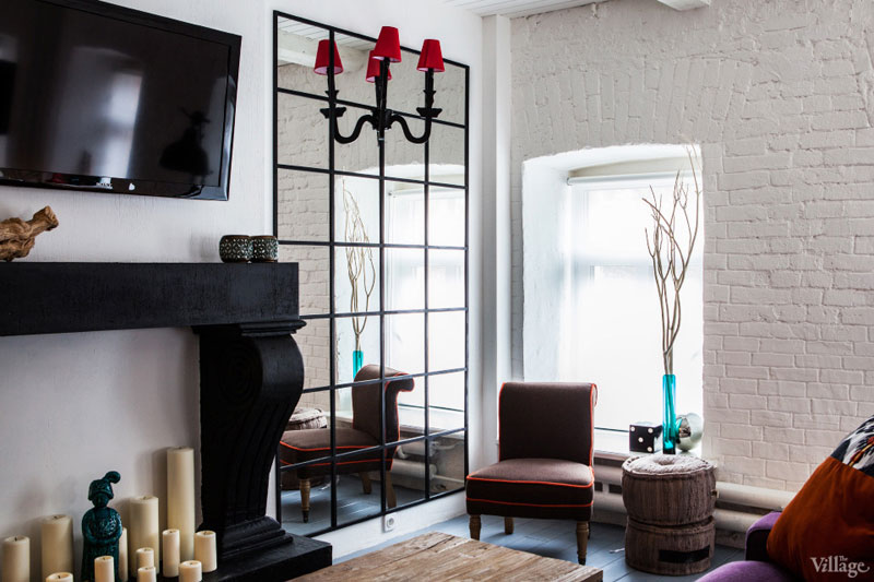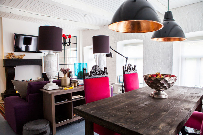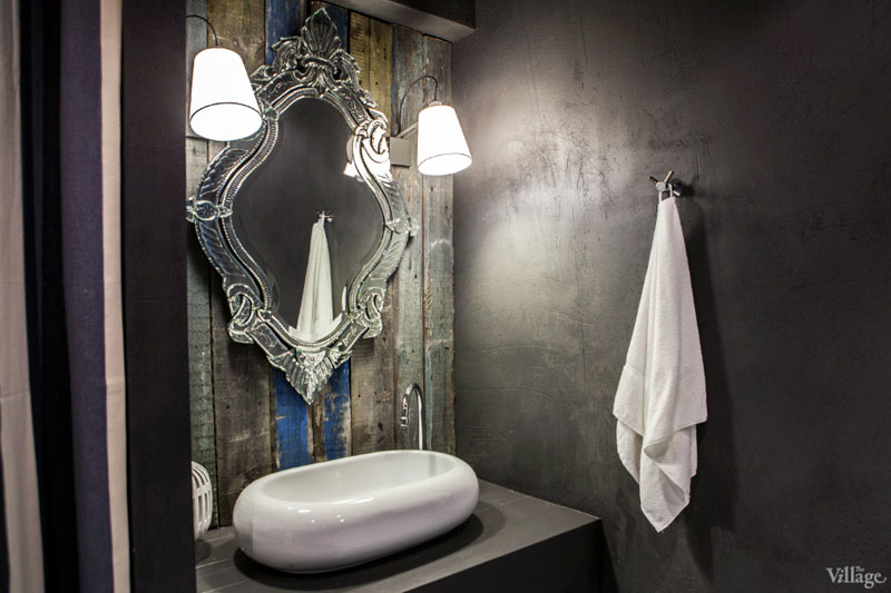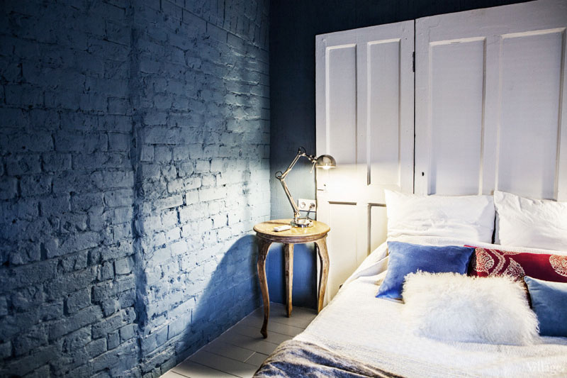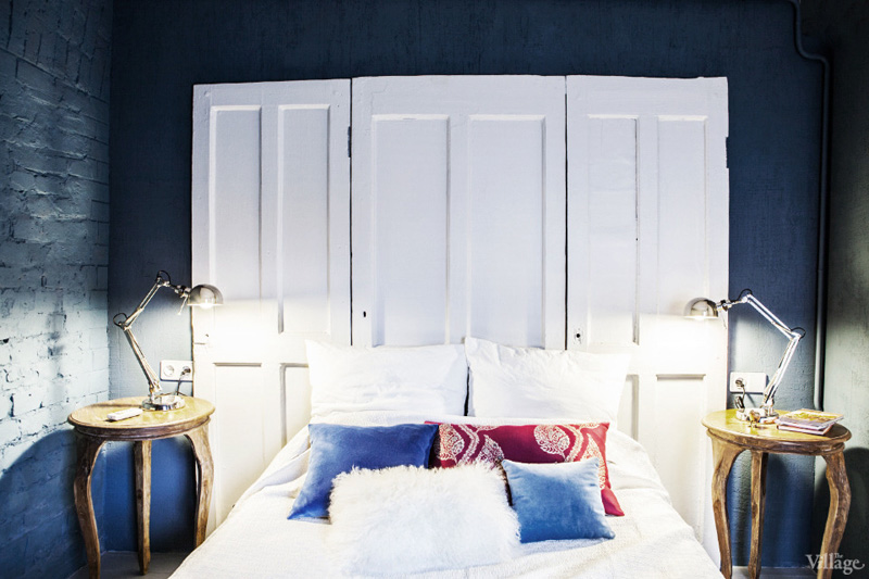 I found this this one-bedroom Moscow apartment on The Village and fell in love. The owners are clearly designers/decorators as it is SO well executed. This is a perfect example of how to use dark colours and large-scale items in a small space for high impact but without making it feel cramped. Several pieces are from Ikea (including the pendants over the dining table with a personal touch of copper leaf on the underside) and many from the couple’s travels. I adore everything – especially the large paned mirrors on either side of the mantel, the massive table lamps that delineate the living from dining spaces, the gorgeous blue bedroom walls, and the Venetian mirror mounted on old fence boards.