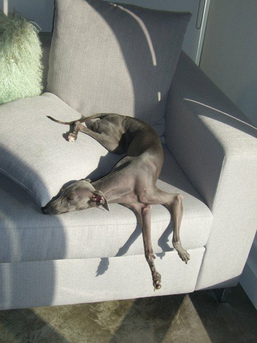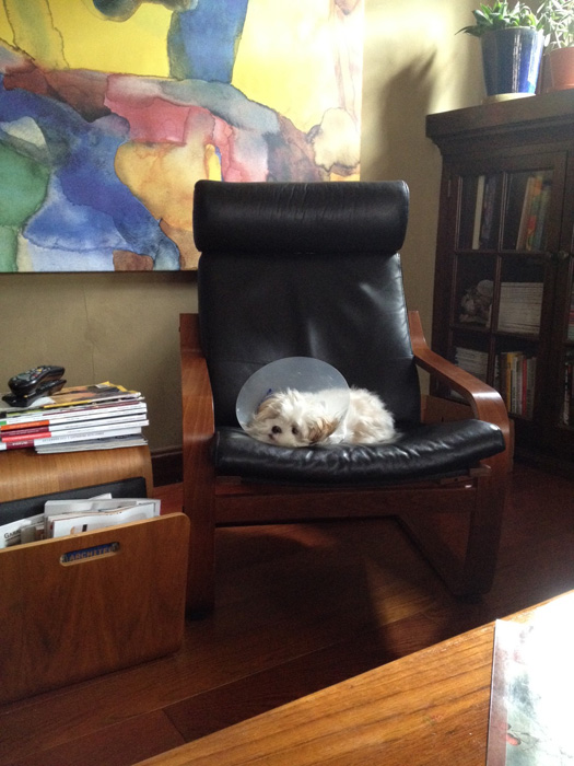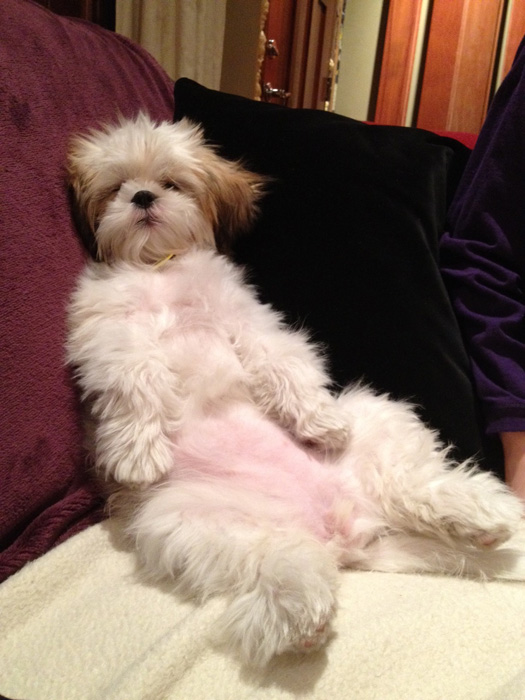 The first is a photo of Cookie, our 6 month old Shih Tzu/Bichon mix rescue puppy. She recently was spayed and has been tolerating her “cone of shame” very well. Normally she prefers to nap on the sofa with a soft blanket, but this day she chose the Ikea Poang chair. I had to snap a picture quickly with my phone before she decided to jump down so the quality isn’t great, but I thought the cone almost looked like a halo around her head and I couldn’t resist sharing. The second is a photo of Cookie lounging on the sofa (pre-surgery). She is adorable, sweet, and clearly has no modesty!