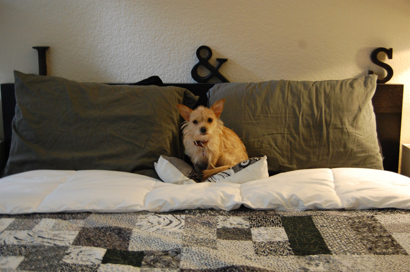 This is Mini, My chihuahua/yorkie/baby, that my husband and I rescued last year. She thinks she’s queen and stays in bed long after I wake up. Bed from IKEA, quilt made by my wonderful Nana.