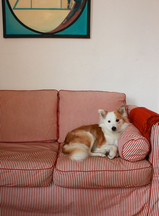 This is Skima, my pet fox, but not really though (she’s an Icelandic Sheepdog). She is a major pillow hog. When she’s not controlling every single centimeter of the bed, this is her favourite place to be, on our old pinstripe sofa, or as we say in Swedish – polkagrissoffa.