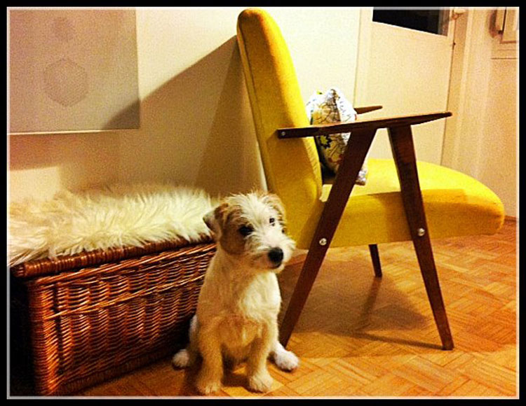 this is my boyfriends dog Ax, 1,5 year old Jack Russell Terrier. We do not allow him to be on a furniture, so I send you a picture of him in front my grandmas old vintage chair 🙂 We love old, new design & our cute dog :))))