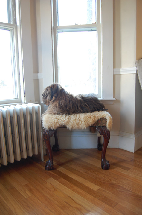 This is Walter, our 5-year-old bearded collie/terrier mix (?) who loves to sit here by the radiator and watch the squirrels. He is sitting on an antique stool, covered in a sheepskin to protect it.