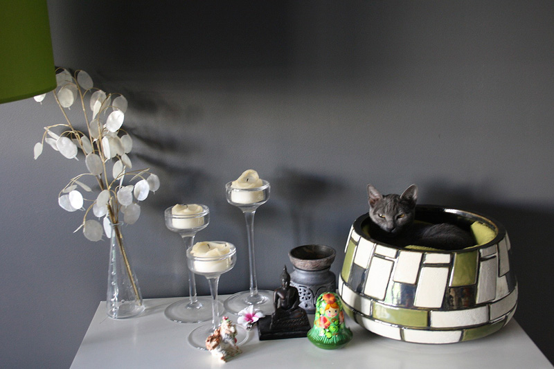 The first photo is of Olivia sleeping in our bowl from AREA on top of our Ikea shelving unit. The second photo is of Olivia next to our crystal Atlantis liquor bottles.