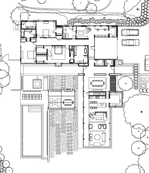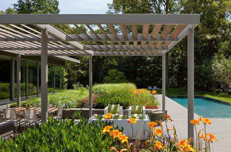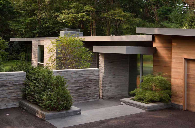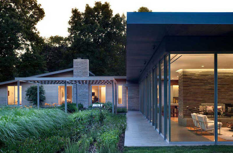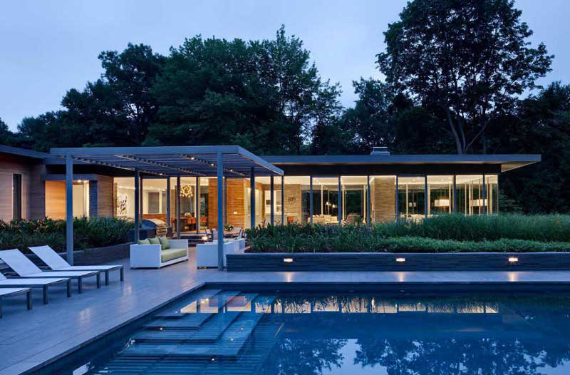 Ohlhausen DuBois Architects have taken a 1950’s ranch house and integrated a new glass pavilion and landscaping to create a home that delights and welcomes. Indoor living spaces now transition easily to the outdoors through a series of terraces, gardens and pool. The house is about mass and volume, light and transparency, solidity and retreat while reaching out to its location. Simple. Elegant. Satisfying and inspiring. Milillo Residence, Sands Point, NY.