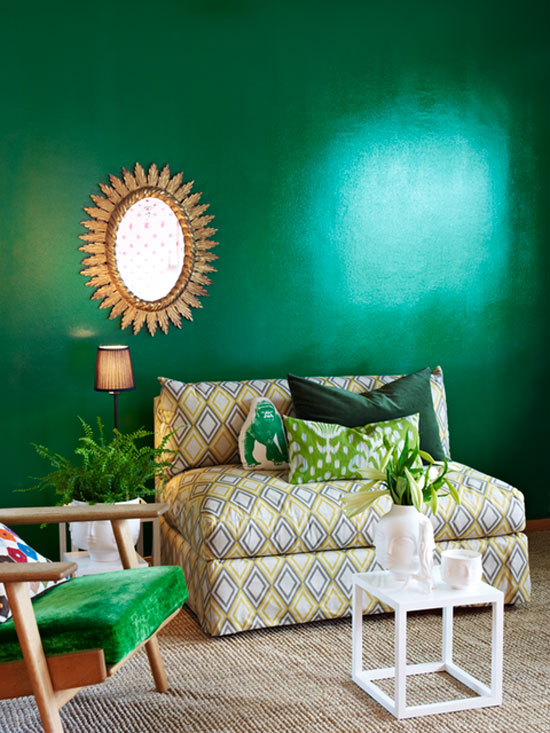 I have to question the whole 'emerald green' thing. Sure, everyone wants a new color for the year, it's always fun. But right off the mark, emerald is looking off: dated and difficult to work with outside ethnic designs. Blue can be brash and lost to nuance, but green? Now there's a hard color to get right. Lime worked, when that was the new thing; my housemate painted her room a vibrant yellow-green that's energetic and young, but with old wood and black trimmings became smart and sophisticated. I can see emerald as a grace note, but certainly not as the main palette choice.