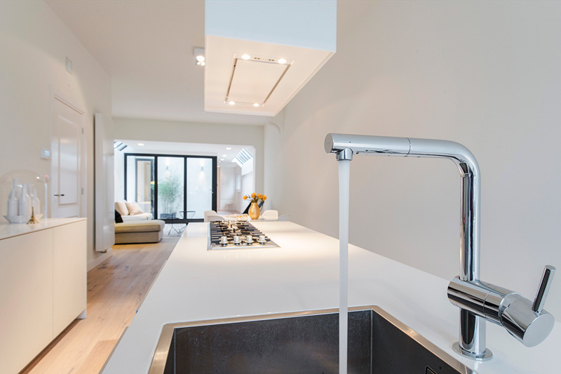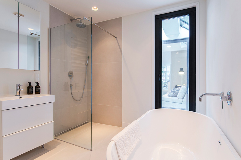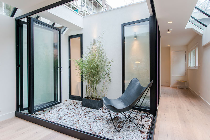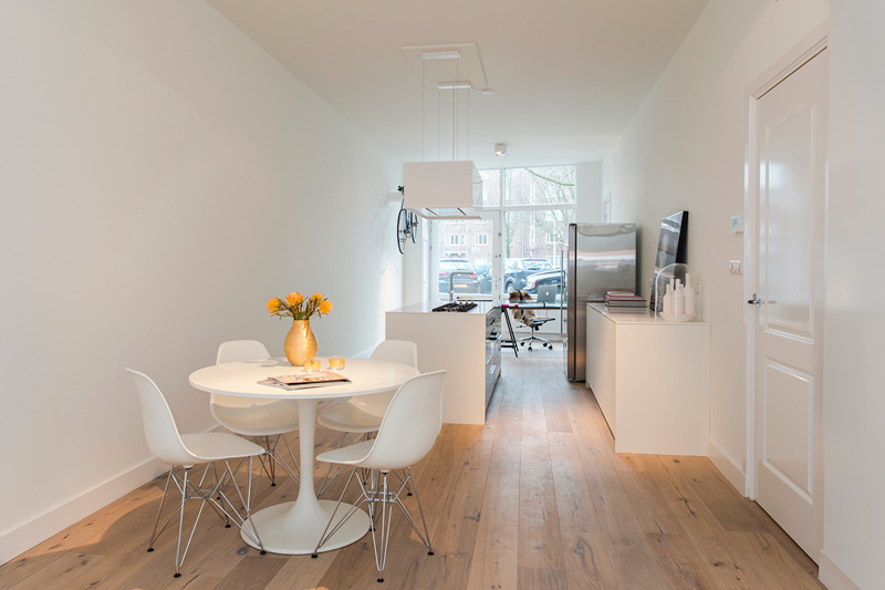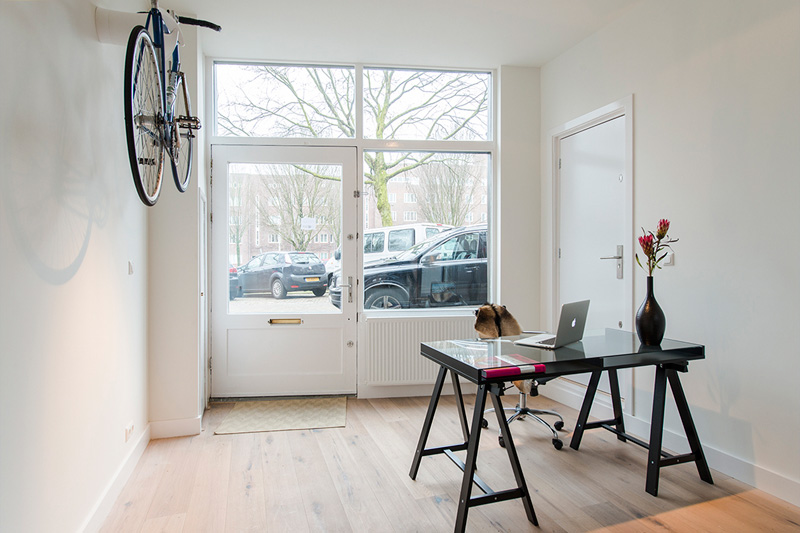 Nicolet, a real estate developer from Amsterdam, emailed with a really impressive project she just completed that I had to share. It is an 90 m2 apartment in De Pijp area. The Ruysdaelkade is formally known as a red light district. It is a studio with a walk-in bedroom and walk-in bathroom. I created a patio to provide more day light. I bought it as on office and turned it into an apartment. It is build around 1920 as a temporary church in name of our Queen, but unfortunately there are no signes of that anymore. Unfortunately, for the sale of houses in Amsterdam, everything needs to be pretty plain without being to eccentric. I absolutely love the simplicity of the space. It allows the gorgeous details to stand out – like the hardwood floors (YES!!). And that patio – so cool!!! (View the listing here)