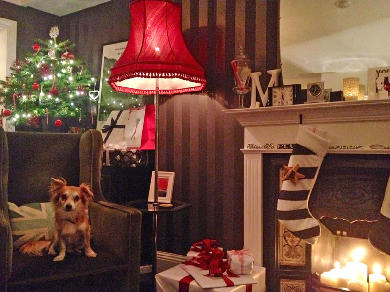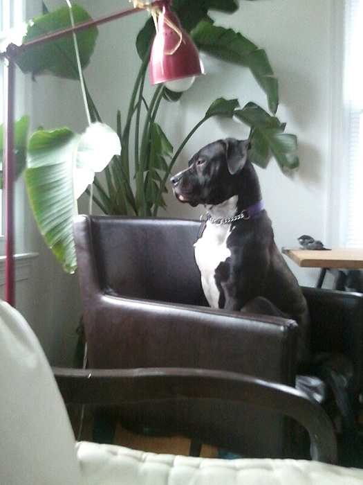 Zizou hangs out on New Year’s Day morning, awaiting great excitement from a newfound perch. Chair from West Elm, lamp from Ikea, enormous plant from who-knows-where.