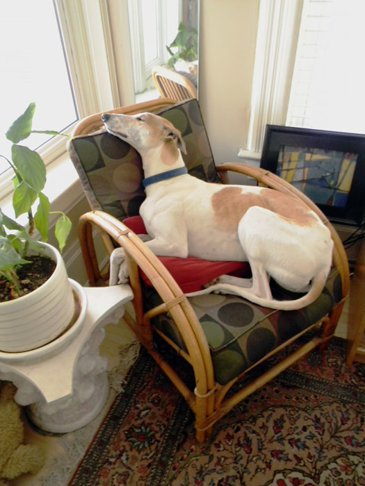 A few weeks after losing my 13-1/2 year-old greyhound boy, Ender (who only once got up on the furniture and was featured in tribute here, I adopted Penny, a 15-month old greyhound girl, who is filling in the empty spot Ender left. Penny has selected one of my vintage rattan chairs as her favorite. The first photo is of Penny in her fierce “watch dog” pose by the window, in case she opens her eyes, she can “watch” something. The second one, I call “bottoms up”, for obvious reasons.