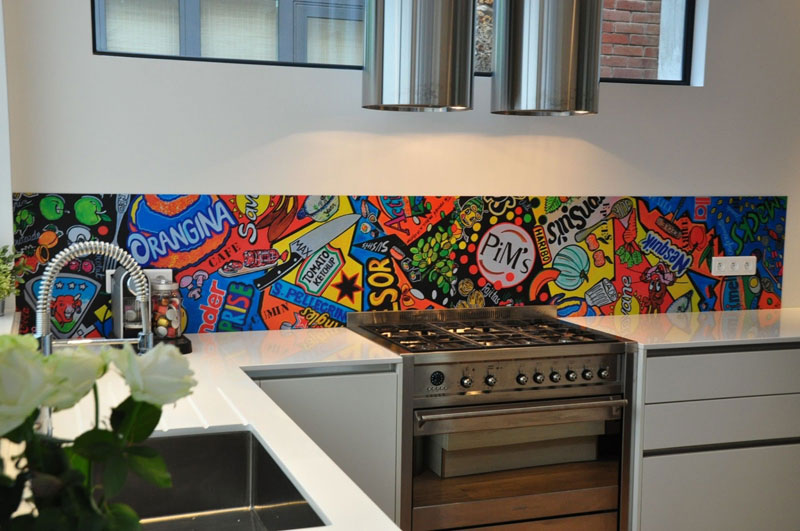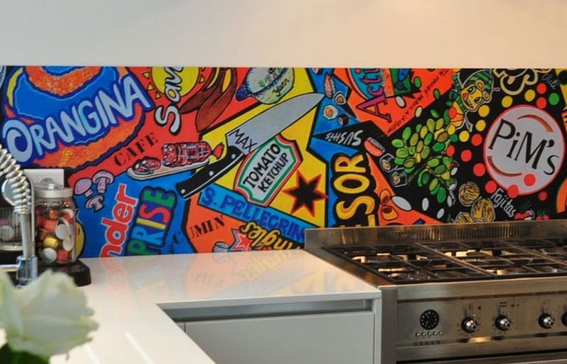 LouiseM is a French story-telling painter whose style is a mix of pop art and street art. She occasionally has the opportunity to personalize her client’s interiors, and in this instance she designed a really funky backsplash. Included in this piece of art are the names of the family members and their favourite foods and drinks. LOVE THIS!!!