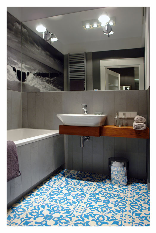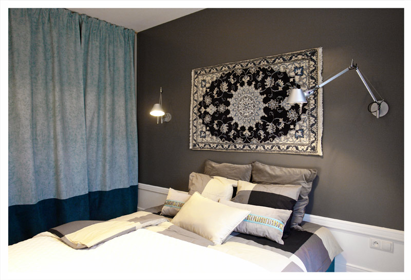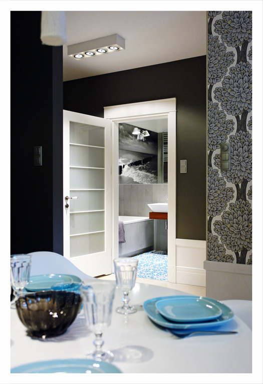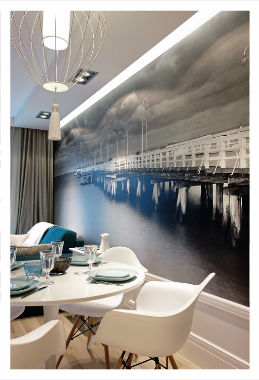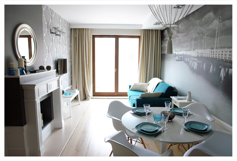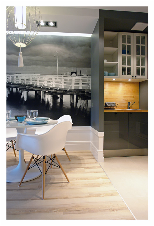 We’ve featured Polish interior designer Lucyna Kołodziejska‘s work a few times in the past (here, here and here), and she emailed recently with yet another fabulous small apartment she designed. This apartment is in Sopot, it is designed for rent, for weekends, for tourist that want to feel some atmosphere of old XIX town Sopot. It is in new building but me and my principal wants to get a climate of old town apartment. It have one bedroom and small bathroom, living room with open kitchen. We have there big photograph of Sopot pier by some Portugal (!) photographer who sold us this photo. In bathroom old morrocan tiles on the floor and photo of Baltic sea made by myself. The flat is 200 metres near the sea side.