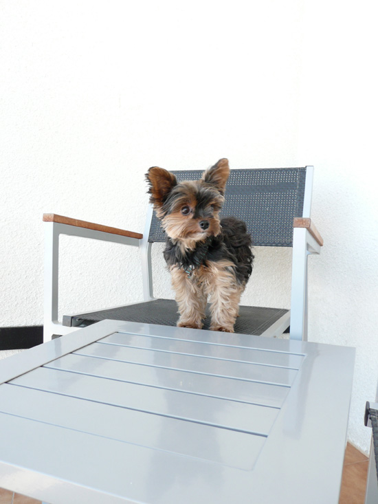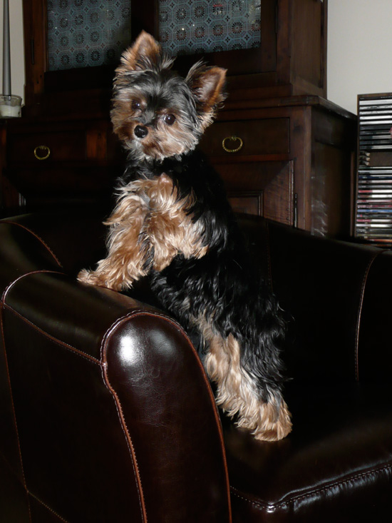 Please find enclosed two pictures of my dog Trinket a tiny Yorkie who doesn’t like to be on the floor but prefers sofas or chairs, if not my arms. These dogs aren’t called “lap dogs” for nothing! The first picture (on the leather chair) was taken at my mother’s place, in the Alps region of France (Savoie) and the second picture (on the grey outdoor chair) was taken on an hotel balcony in Spain (Catalonia).
