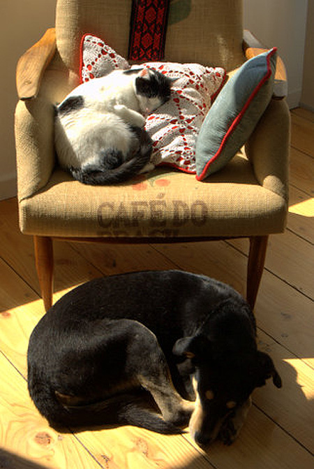 Here’s a photo of my sister’s pets, India (the cat) and Rufino (the dog) catching a few rays on and near her mid-century chair which she had covered with a Brazilian coffee bean sack. Rufino is an ex street dog who followed my niece home one day and never left. Can’t say I blame him!