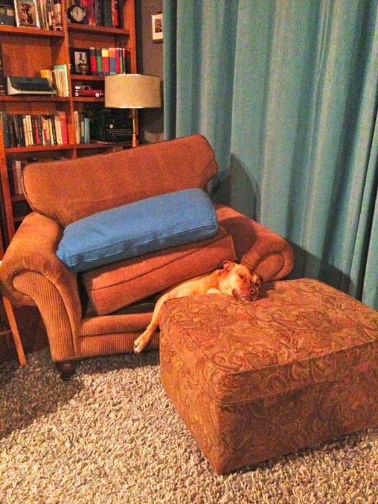 This is Sookie (in Seattle WA) and she likes to build forts. The Big Brown Chair is her favorite, but she can work with almost any piece of furniture, and has many different “poses”.
