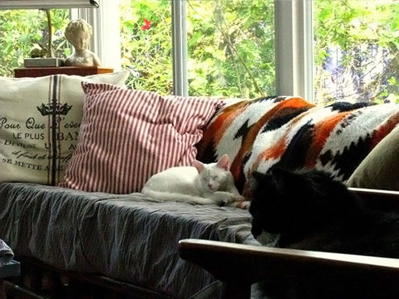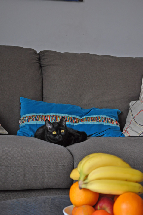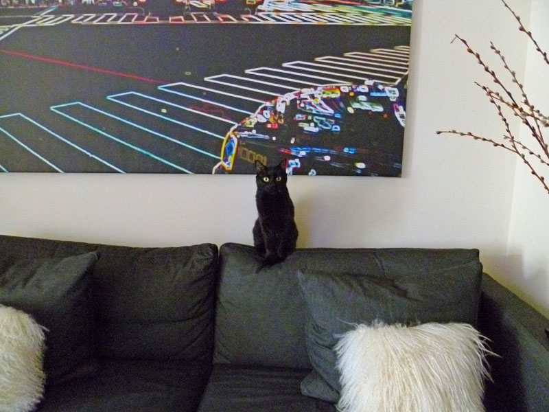 Nisha, our slightly neurotic black cat sits atop the living room couch and Lona, our beloved tailless tortie on top of the dining room table.