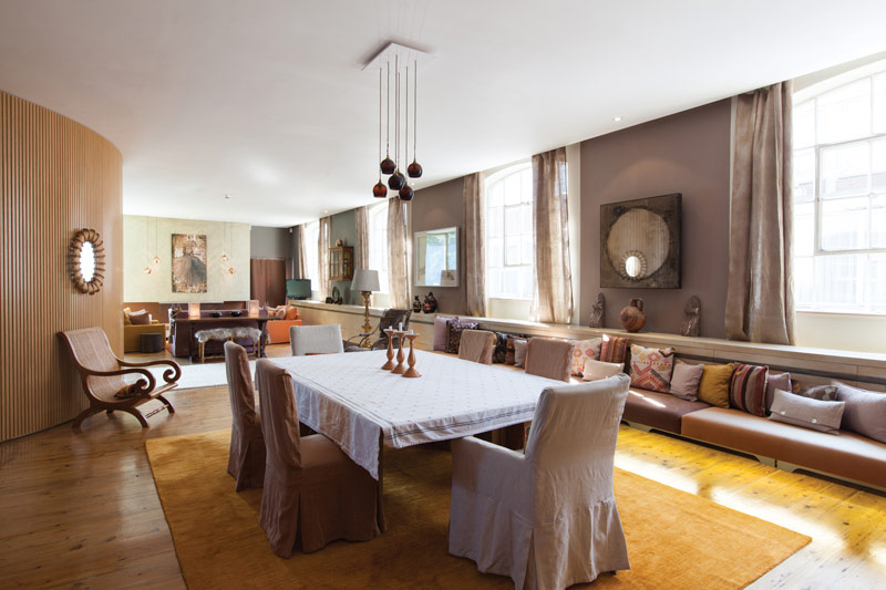 Check out this London penthouse filled with jolts of colour for sale via Domus Nova. Woodstock Studios is owned by artists and the three floor apartment forms part of an old BBC building in Shepherd’s Bush. It was converted in 1992 by named architect Jonathan Tuckey and the current owner has combined colour and wacky design with the existing architectural details to great effect. The top floor which forms an artists studio and bedroom makes use of the lovely natural light. Colour is softened in the huge sitting room where texture plays a big role but this is ramped up in the small sitting room with its vibrant orange walls. Acid green has been used in the second bedroom and the master bedroom features soft grey which is also echoed in the huge hand carved bath tub. Colour has even been taken outside and the top floor balcony has been treated to vivid candy pink.