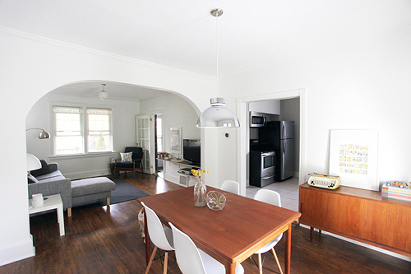 It’s so much fun to see what a little paint, blood sweat and tears can do to a home that desperately needs an update. Beth sent us some before and after photos of her home that she’s been slaving over for the past year and I am in awe of the transformation. It is now much more modern slathered in white paint, and the kitchen renovation is a ridiculously effective update for not much cash. She’s clearly a fan of mid-century modern design so that’s a bonus in my book. Here are a few before photos to get you started.