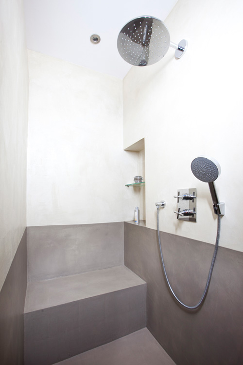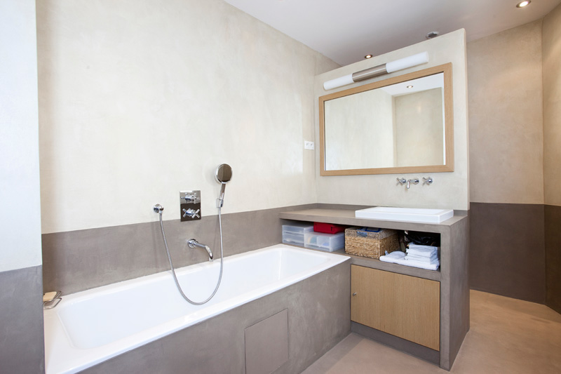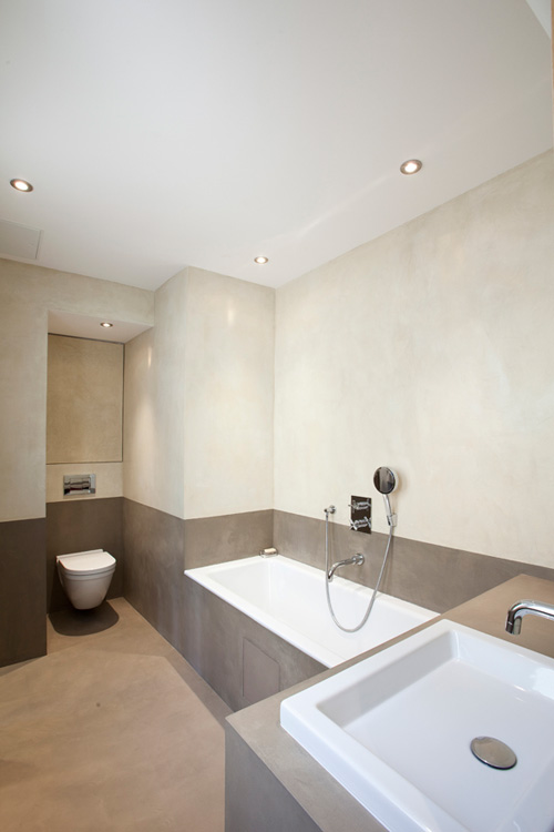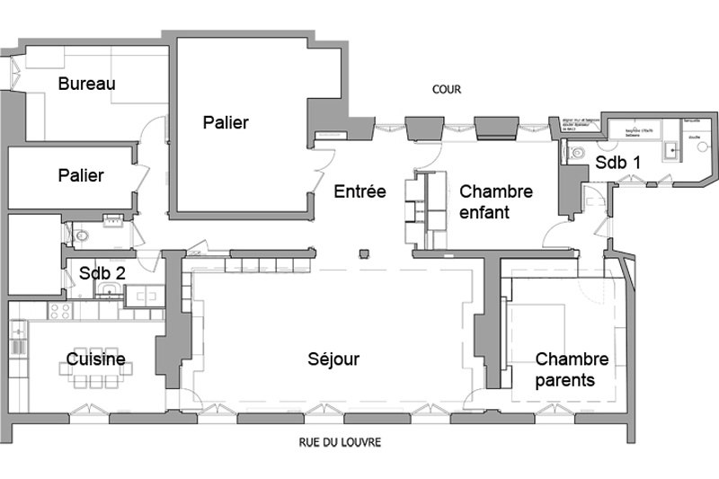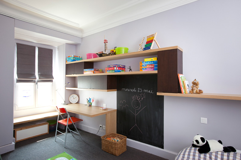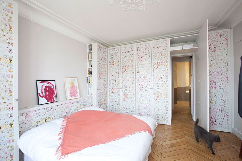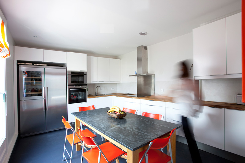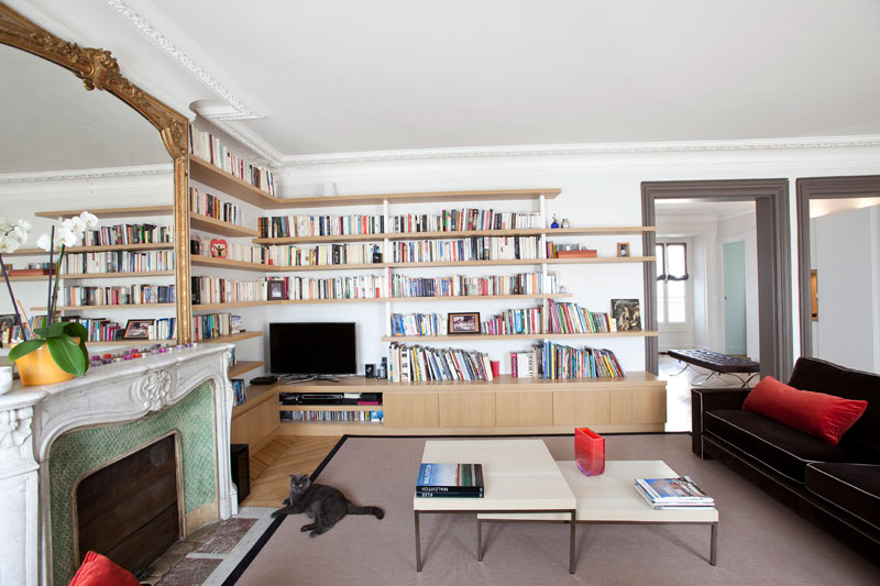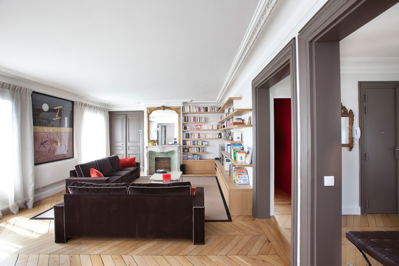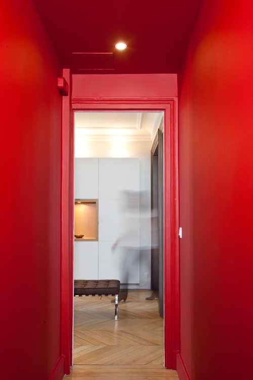 Here is Alia Bengana‘s second project she sent over: Apartment in the heart of Paris 1st arrondissement overlooking the biggest Paris construction site. This project was about giving some personality to this apartment, creating as much as possible built in cupboards and bookshelves in an apartment that had none. The materials chosen for those small interventions here and there were natural oak, dark colored oak, lacquered mdf, and colored cement resin for the bathrooms and kitchen floor. The classical Paris molding around doors were painted in dark grey in order to highlight them with a contemporary twist. A very long and dark corridor was painted bright red. Love the floor, and the red hallway is a fun idea in an otherwise boring space!