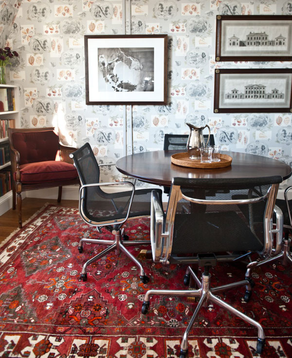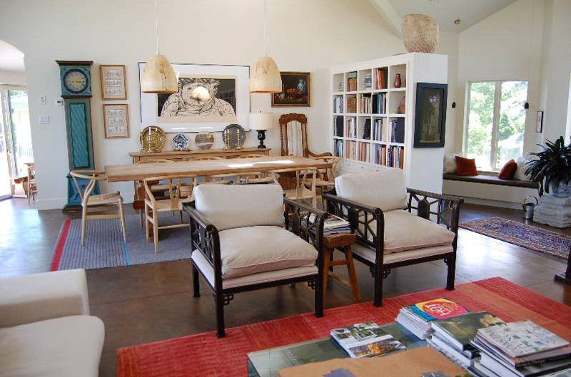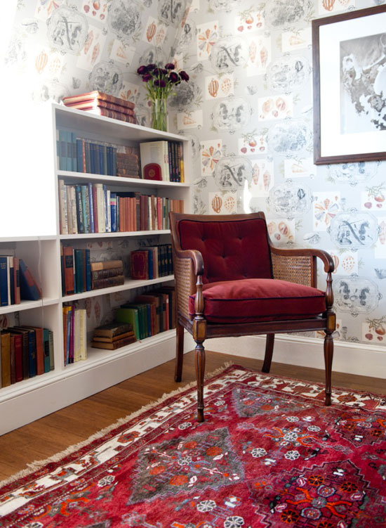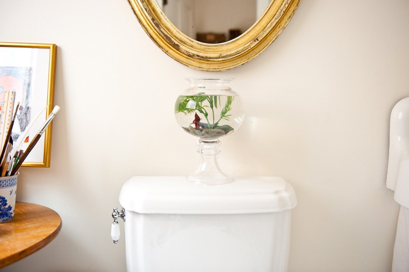 I really LOVE this, it seems so practical and livable (besides the live fish on the toilet ;)! The look of built in shelving, the wood floors, the rugs, the banquet… sigh…. I must bookmark it.