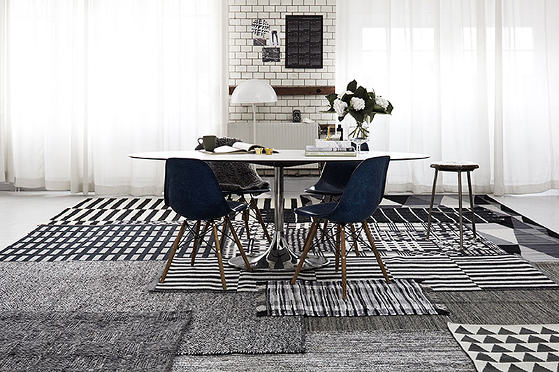 The layering effect does look way cool. I like the graphic approach and the use of blacks and grays. And I think it would be a pain in real life. However, I was at a friend's house who did lay lots of small rugs down on marble flooring to protect her toddler. So, it is done in real life too! Thanks for sharing!