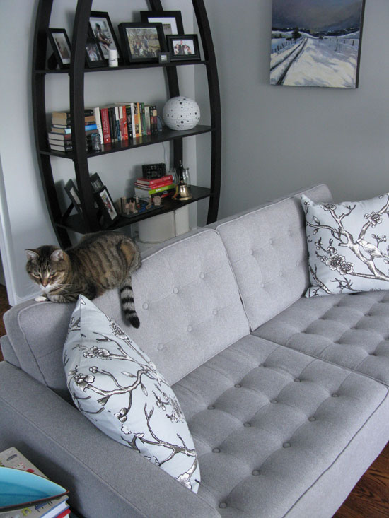 Here is a photo of Shoppy enjoying my brand new sofa. He loves being able to survey the room from his perch.