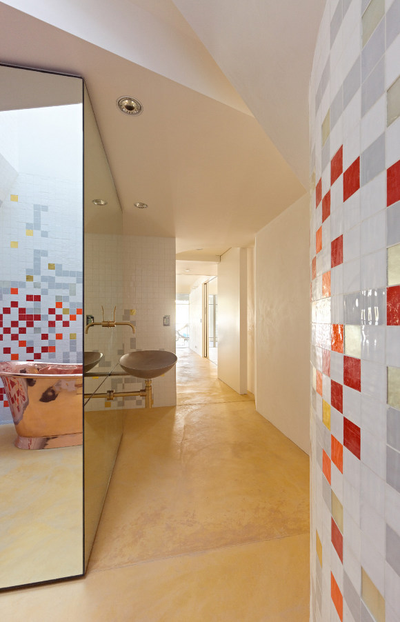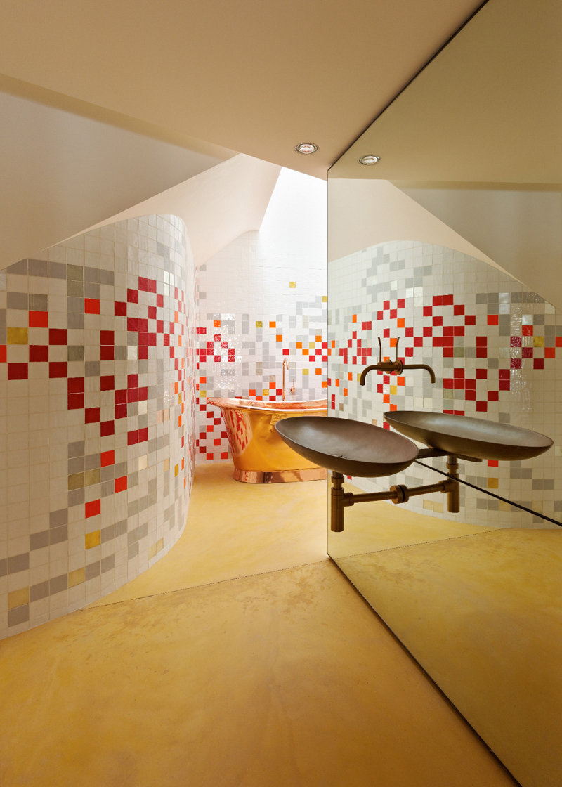 Wow. I was in love until I got to the pictures of the bathroom. Seems odd to put such overpowering tile around that extraordinary tub. I would have let it shine on its own but each to their own I guess.