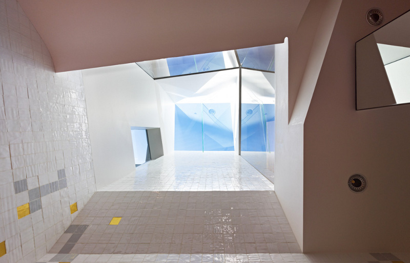 all I could think of-was how hard it would be to heat that bathroom…you'd freeze in that bath with that huge open ceiling over it. I know the architects were probably under fairly strict heritage constraints when they designed this space-but I've seen nicer!