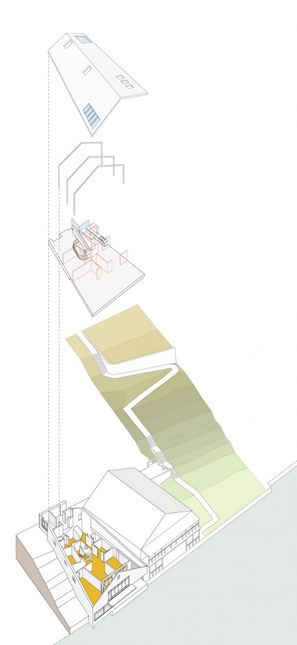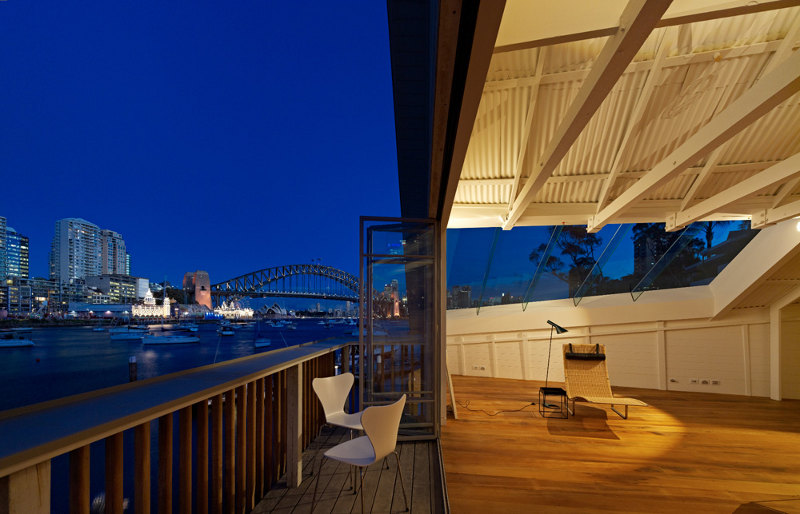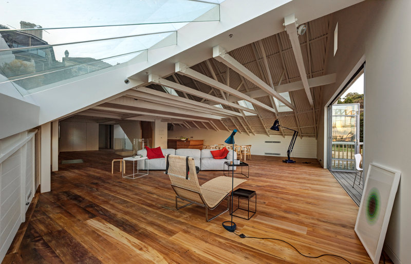 Lavender Bay Boatshed, a three storey apartment in the renovation of an historic timber building on Sydney harbour. The design explores space, solid and void, pulling and stretching and piercing. The expansive and public meets the private and contained all tied together with skylights and shafts that frame “that” view and draw in the light. By Stephen Collier Architects.