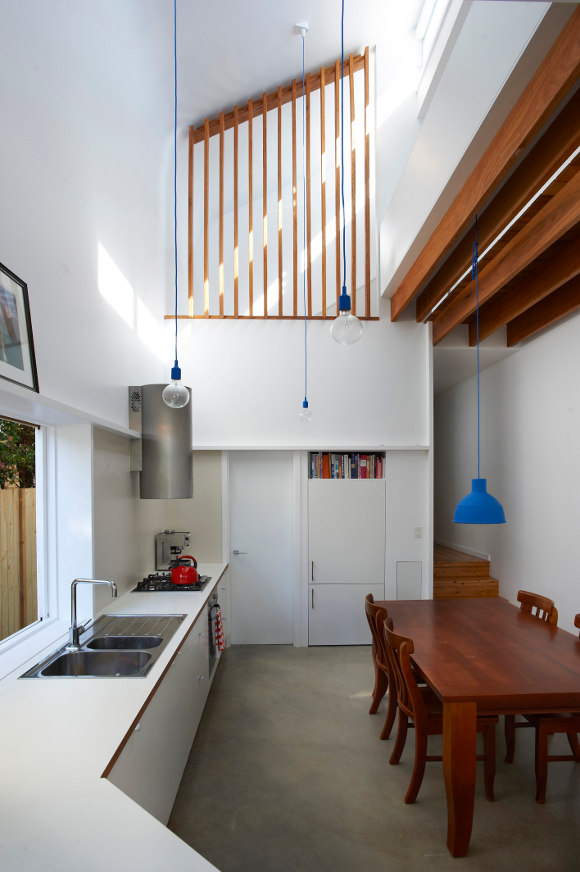 A narrow 3.6m, south facing semi in Freshwater, Sydney. Not much space, little light. What do you do when you need more space, don’t have a wad of cash to throw at your problem and are looking for a cool design solution? Architect David Boyle has extended the rear of the house, opening it up to double height and turning a wall of glass to the coveted northern light. Timber plays off white surfaces adding richness to a casual family home. Although the budget was limited style is definitely not.
