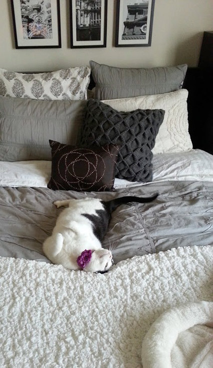 My cat Bella Jade is sitting atop a vintage sofa from my Grandmother that I recently had reupholstered. The next photos are of her loving the sunlight on a cozy bed.